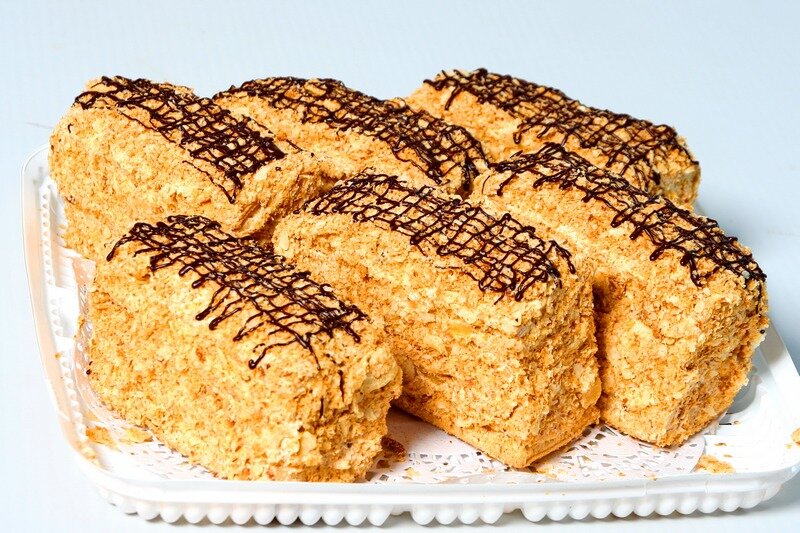 Рецепт #3 из 5 рецептов на 9 марта Ингредиенты Для теста: 500 г сливочного масла, 4 стакана пшеничной муки, 1 чайная ложка соли, 1 стакан воды. Для заварного крема: 1 стакан муки, 1,5 стакана сахарного песка, 1 столовая ложка крахмала, 6 яиц, 5 стаканов молока, 1 чайная ложка ванильного сахара. Для украшения: 5 столовых ложек сахарной пудры. Способ приготовления Из муки, сливочного масла, соли и воды замесите слоеное сдобное тесто, разделите его на три части и раскатайте в пласты толщиной 0,50,7 см. Вырежьте квадраты размером 7 Х 7 см. Вилкой проколите их в нескольких местах. Выпекайте квадраты 10 минут на сильном огне при температуре 230 °С, а затем 30 минут при температуре 180 °С. Готовность квадратов определяется по светло-коричневой корочке. В эмалированную посуду высыпьте муку, сахарный песок и крахмал и хорошо перемешайте. Молоко подогрейте и тонкой струйкой влейте в смесь. Поставьте на маленький огонь и варите, постоянно помешивая, до загустения. В готовый к