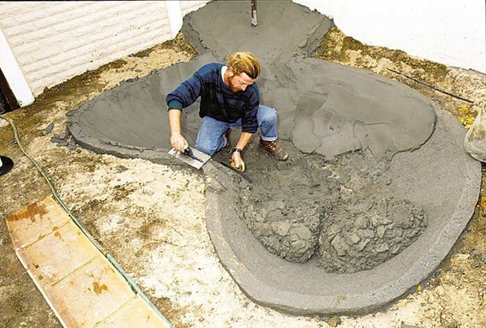 Наиболее затратный и трудоемкий, одновременно самый благодарный с архитектурной точки зрения и гибкий в использовании материал для создания русла ручья. Бетон отлично подходит для оформления галькой, легко декорируется растениями и прячется в земле. Однако при работе с бетоном нужно всегда использовать проволочную сетку в качестве каркаса, чтобы форма готового изделия соответствовала ожиданиям, а сверху на него следует обязательно укладывать один слой пленки.