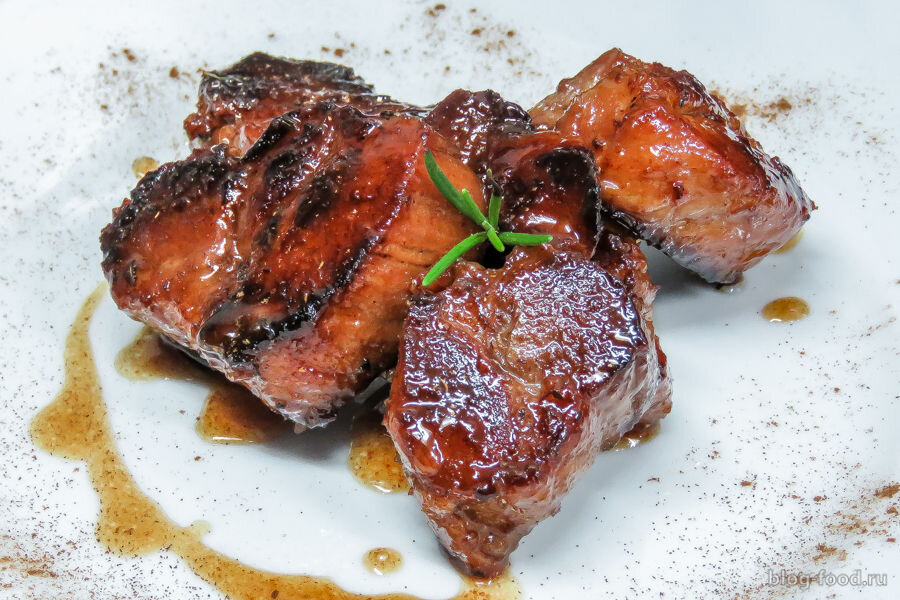 Добрый день! В кулинарии бывают моменты, когда используются, на первый взгляд, несочетаемые ингредиенты. Например добавление в варящийся кофе нескольких крупинок соли очень хорошо влияет на вкус готового напитка. Или небольшое количество сахара в абсолютно «солено-ориентированных» рецептах способно сильно обогатить вкус и придать неожиданные нотки готовому блюду. Сегодня ударимся во все тяжкие и последуем за известным шеф-поваром Ильёй Лазерсоном. Мясо в сладкой, медовой карамели — казалось бы, что за странное сочетание? А вот очень о-го-го, скажу я вам! Необычно, непривычно, ярко и невероятно вкусно! Продуктовый набор: Свинину сначала сварим с овощами. Режем всё на удобные для кастрюли, куски: Ставим кастрюлю с холодной водой на огонь, загружаем морковь, оба лука, чёрный перец, лавровый лист и тимьян, доводим до кипения и кладём свинину. Варим часика полтора: Когда свинина сварилась, откладываем её в сторону. Бульон в данном рецепте нам не понадобится, но настоятельно рекомендую его с