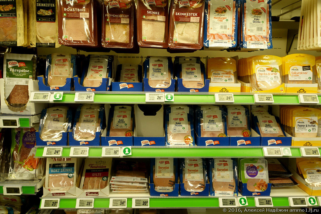 Литр молока в супермаркетах стоит 13-20 крон (104-160 рублей). Батон хлеба - 35 крон (280 рублей), самая маленькая и дешёвая булка - 5 крон (40 рублей), сладкая булка - 11 крон (88 рублей). 100 грамм ветчины в нарезке - 20-35 крон (160-280 рублей). 12 яиц - 32 кроны (256 рублей) . Литр сока - 25-30 крон (200-240 рублей)