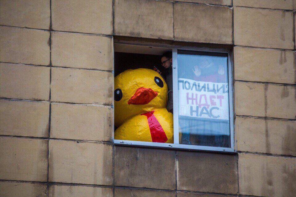 Активиста, который показывал уточку из окна оставили под арестом. Его увели в наручниках из зала суда.