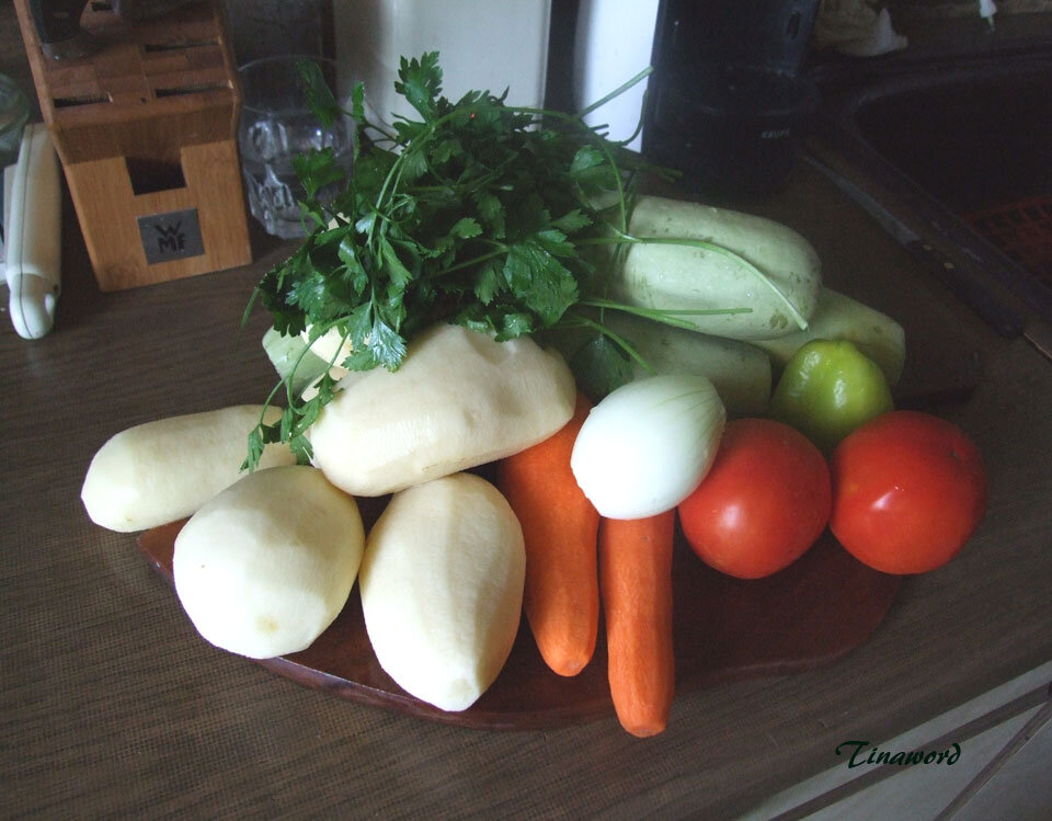 Взяла 4 небольших кабачка, 5 больших картофелин, головку лука, один болгарский перец, 2 больших помидора, 2 моркови и небольшой пучок петрушки. К этому прибавила 2 столовых ложки растительного масла и 1/4 столовой ложки соли.