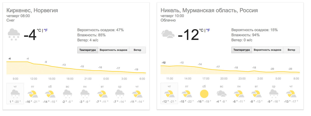 Когда я писал этот пост, специально проверил погоду в соседних городах по разные стороны границы. Между норвежским Киркенесом и российским Никелем 50 километров и внушительный перепад температур. Правда, что ли, граница климата проходит по забору? 😃