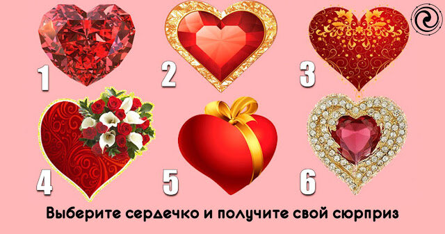 Все, что вам необходимо – это выбрать одно понравившееся вам сердечко, а затем прочесть свой результат! Символ сердца всегда означал Любовь , счастливую и пламенную, а также несчастную и безответную. Только лишь с одним отличием, неразделенная любовь изображалась в виде разбитого сердца. Сегодня мы предлагаем вам пройти этот необычный психологический тест-предсказание, который поведает вам много интересного. Вас ждет сюрприз! Сердечко №1 Рубиновое сердечко сулит вам радость. Забудете все печали и тревоги, позвольте себе любить! Вашему партнёру очень повезло, что вы есть. А если так получилось, что вы сейчас без пары, то знайте, это сердечко предвещает новое интересное знакомство.Только лучшее ожидает вас в скорости! Сердечко №2 Сердечко с золотым ободком говорит о том, что вас обуздают новые и яркие любовные эмоции. Что станет этому причиной, сюрприз от любимого человека или новое знакомство, вы узнаете в самое ближайшее время. Будьте готовы к приятному сюрпризу! Сердечко №3 Вы выбра