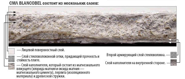 СМЛ (Стекломагнезитовый лист) В последнее время значительную популярность приобрел этот листовой отделочный материал на основе оксида магния, содержащий магнезит, перлит, бишофит, части древесной стружки, а также стеклоткани как армирующего материала. ОН весьма эффективен для отделки наружных и внутренних стенных поверхностей, в строительстве внутренних перегородок, в подготовке полов и потолков. Стекло-магниевый лист обладает высокой жаропрочностью и огнеупорностью, благодаря чему используется для обустройства эвакуационных помещений зданий. Позитивной стороной материала является легкость его обработки, а специфика его монтажа почти точно соответствует таковой популярного и хорошо известного гипсокартона. Стекло-магниевый лист (популярно сокращение СМЛ) обладает уникальными свойствами, в частности, при нахождении в воде сроком более 100 суток не теряет свойств и не изменяет форму, свободен от вредных веществ, не токсичен, не имеет никакого запаха, совершенно не горюч, при нагревании р