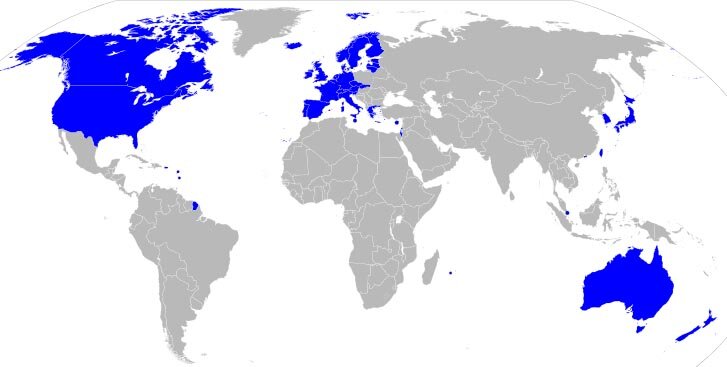Сейчас по мнению Международного Валютного Фонда экономически развитыми являются все государства Западной Европы: Австрия, Бельгия, Великобритания, Германия, Греция, Дания, Израиль, Ирландия, Исландия, Испания, Италия, Кипр, Люксембург, Мальта, Нидерланды, Норвегия, Португалия, Сан-Марино, Финляндия, Франция, Швейцария, Швеция. Надо заметить, что имеется в виду Республика Кипр, а Турецкая Республика Северного Кипра развитой не считается. Такие страны, как Греция и Португалия имеют довольно низкий уровень жизни в сравнении с остальными и включены в этот список поскольку являются членами Евросоюза.