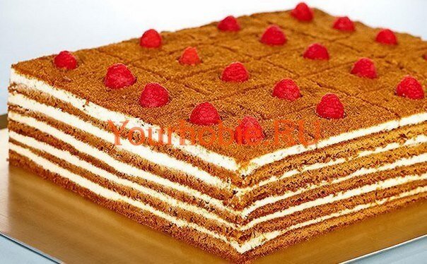 Ингредиенты: Для теста: 1 ст,л. мёда, 1 яйцо, 1 стакан сахара, 50 г сливочного масла, 3 ст.л. молока, 2 стакана муки Для крема: 500 г густой сметаны, 1 стакан сахара, по вкусу и желанию свежая клубника, малина, для украшения орехи, шоколад ПРИГОТОВЛЕНИЕ: Все продукты(кроме муки и соды) положить в миску и поставить на кастрюлю с кипящей водой. Когда продукты растворятся, снять миску, добавить 1/2 ч.л. соды, муку, замесить тесто, поставить на холод. Затем разделить тесто на 5-6 частей и раскатать коржи.Помогая руками, тесто распределите на смазанной сковородке . Выпекать коржи до светло-коричневого цвета. Крем: взбейте сметану с сахаром. Кремом прослоить коржи и обмазать весь торт. Сверху можно засыпать орехами или тёртым шоколадом Поставить в холодильник на ночь, чтобы хорошо пропитался. Приятного чаепития!
