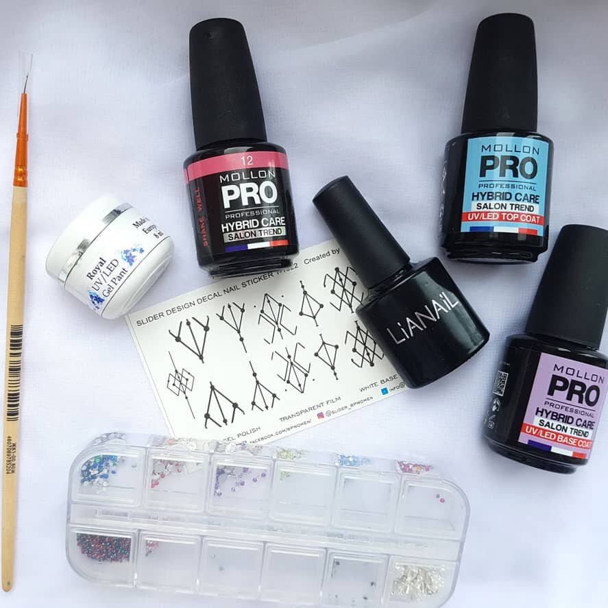 1. База (например, HYBRID CARE SALON TREND UV/LED BASE COAT); 2. Топ (например, HYBRID CARE SALON TREND UV/LED TOP COAT); 3. Цветной гель-лак (здесь Mollon Pro HYBRID CARE SALON TREND 12); 4. Слайдер-дизайн (здесь слайдер 1-1022); 5. Тонкая кисть (например, Roubloff страйпер 10); 6. Гель-краска; 7. Матовый топ; 8. Стразы. На все ногти наносим базу (например, HYBRID CARE SALON TREND UV/LED BASE COAT) и цветной гель-лак (здесь Mollon Pro HYBRID CARE SALON TREND 12). Далее можно взять кисть и гель-краску и начать рисовать, но чтобы добиться ровного и симметричного узора используем слайдер-дизайн "BPW.Style" (номер 1-1022). Кладем слайдер на средний и безымянный пальцы (технику нанесения слайдер-дизайна смот