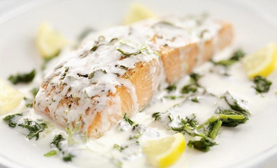 🔸 На 100 гр - 130.67 ккал 🔸 Б/Ж/У - 9.38/3.07/8.12 🔸 🔹Ингредиенты:: • Филе лосося - 800 г • Лимон - ½ шт • Натуральный йогурт - 300 мл • Желтки - 3 шт • Горчица дижонская - 2 ч. л • Базилик - 10 г • Укроп - 10 г • Петрушка - 10 г • Эстрагон - 10 г • Соль, перец - по вкусу 🔹Приготовление: Лосось получатся нежным и ароматным, но таким способом можно готовить практически любую рыбу. Филе лосося нарежьте продолговатыми кусочками шириной 4-5 см, положите в неглубокую форму для запекания. Старайтесь укладывать рыбу плотно, не оставляйте большие зазоры между кусками, иначе соуса потребуется слишком много. Посолите, поперчите и сбрызните лимонным соком. В миске соедините йогурт и яичные желтки. Мелко нарежьте зелень и всыпьте ее в сливочную смесь. Туда же мелко натрите лимонную цедру и добавьте горчицу. Залейте получившимся соусом рыбу и поставьте в разогретую до 200 градусов духовку. Запекайте около 20-25 минут до загустения соуса. Подавайте блюдо, пока не остыло. Приятно