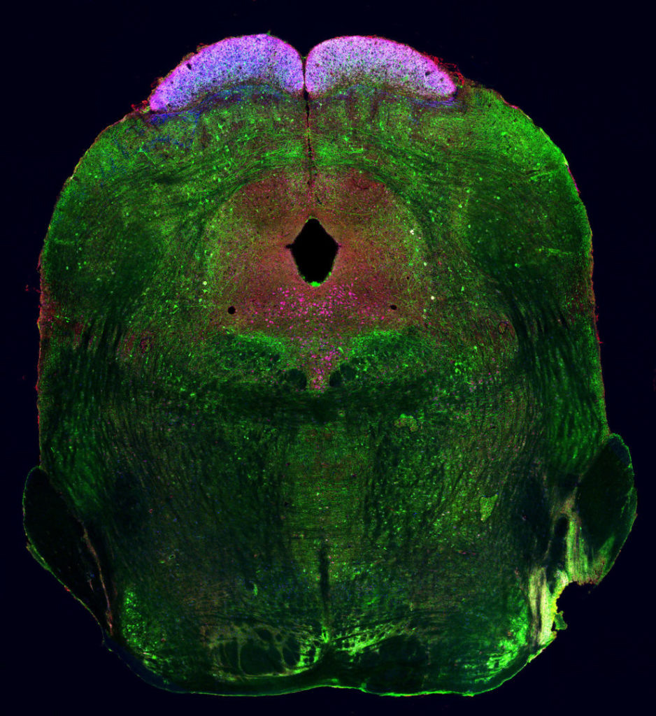 Credit: MASMITH12/Neuroart Перед вами — ростральное (в анатомии ростральный — носовой, буквально — располагающийся ближе к клюву. Располагающийся ближе к голове или к переднему концу тела) сечение среднего мозга мыши на уровне верхнего двухолмия. Зеленым цветом окрашены ГАМК-эргические интернейроны. Красным показаны аксоны ганглионарных клеток сетчатки, синим — места проекций этих клеток. Читайте материалы нашего сайта в Facebook, ВКонтакте и канале в Telegram, а также следите за новыми картинками дня в Instagram.