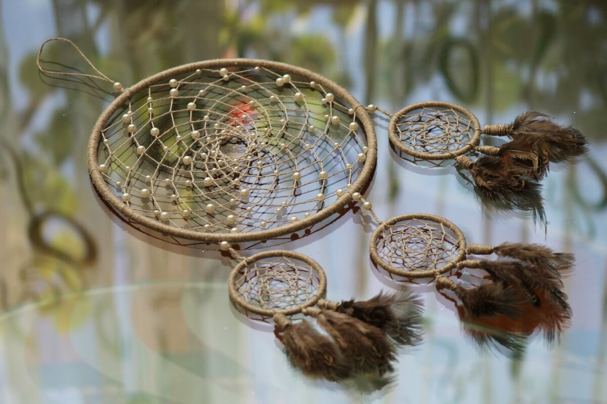 Талисман ловец снов - своеобразный «фильтр» ночных видений. Его цель – оградить владельца от кошмаров, пропустив хорошие сны через пустую середину. Амулет есть в свободной продаже как сувенир. Для одних, ловец снов – это элемент декора дома или уместный подарок, для других — магический атрибут. Человеку, который будет использовать такой амулет, нужно серьезно и внимательно подойти к выбору, и тогда ловец станет источником только хороших снов. При желании и минимуме умений каждый сможет изготовить его самостоятельно. Легенда народа Лакота о появлении и назначении ловца снов Старейшина племени, взойдя на гору, встретил учителя мудрости. И выглядел тот как гигантский паук. Пока двое разговаривали, паук сделал кольцо из ветви ивы, украсил его птичьими перьями и приступил к паутине внутри. И пока плел ее, изрекал, что кольцо – это жизненный круг человеческий – рождение, младенчество, взрослая жизнь, забота о своем потомстве. Учитель договорил и закончил плести, оставив отверстие в центр