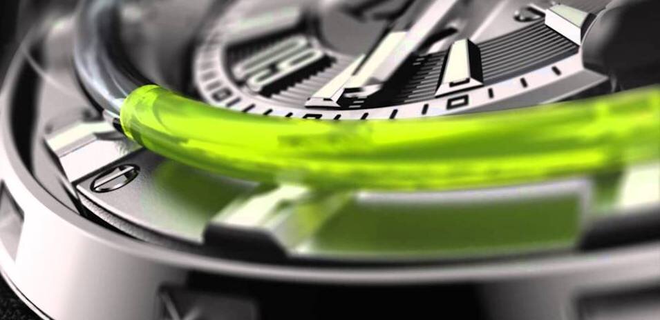 Жидкость вместо стрелок! Да, да, вы не ослышались. Компания HYT еще в 2015 году придумала такую модель и назвала ее HYT H1. Функцию стрелок там выполняет текучая субстанция яркого зеленого, синего или красного цвета. Создатели именуют её "Fluorescein". Трубка с вязкой жидкостью жидкостью опоясывает весь циферблат. В движение её приводят два поршня. расположенные между 5 и 7 часами. Поршни управляются хитроумным механизмом. Если хорошо приглядеться, можно заметить, что жидкостей в трубке не одна, а две: цветная и прозрачная. Они двигаются, толкая друг друга. Всю эту гидромеханику придумывала целая команда инженеров компании. Когда хозяин часов вращает заводную головку, жидкости двигаются по трубке, реагируя на поворот. Такой принцип индикации времени еще называют ретроградным: стрелка делает полный круг по циферблату до отметки 6 часов и вновь возвращается в начало отсчета. Механизм часов по традиции открыт для просмотра - его защищает только прозрачное стекло. Через стекло можно набл
