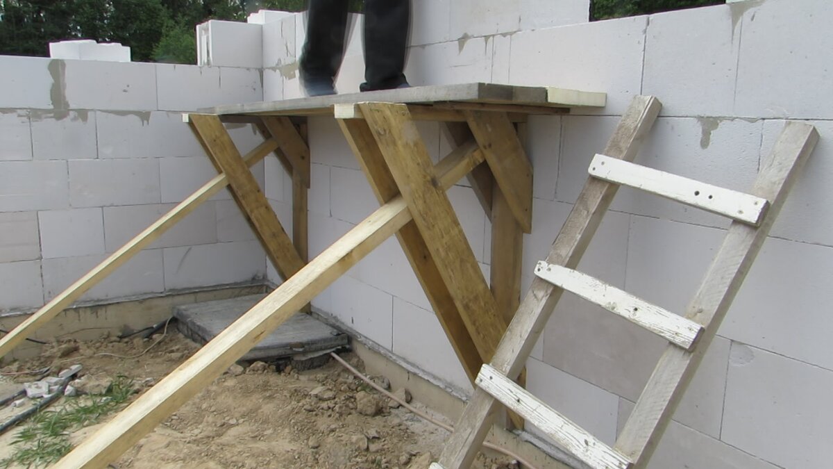 Во время строительства или ремонта часть работ нужно выполнять на высоте, с помощью лестницы это делать не всегда удобно, а порой невозможно. Для разовых и небольших работ, как правило, никто не покупает промышленные строительные леса из металла, обычно их делают из дерева. Рассмотрим вариант строительных лесов подмости-конверты (армянские леса), их часто используют, когда есть возможность опоры на стену, чтобы не создавать громоздкие леса. Основой этих строительных лесов являются "конверты" - треугольные опорные площадки. Для их изготовления используется пиломатериал толщиной 40-50 мм. Верхняя опорная доска крепится к прилегающей к стене сверху, для перестраховщиков можно усилить узел металлическим уголком. Пиломатериал я бы выбрал из елки, потому что значительно легче сосны и нет крупных сучков, снижающих прочность. С обеих сторон создаются укосины из доски толщиной 25-30 мм, крепление производить гвоздями!, а не черными саморезами, потому что гвозди лучше работают на срез: гнутся,