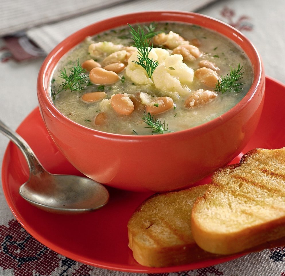 3. Добавить соцветия цветной капусты, половину фасоли и бульон. Довести до кипения, уменьшить огонь и варить 10 минут. Капуста должна стать мягкой.