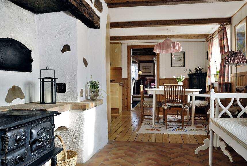 Объединяйте пространство Часто в старых домах кухня едва дотягивает своей площадью до 8 квадратных метров, а столовая и вовсе, бывает отсутствует. Из-за большого очага, который в современное время бывает и вовсе не используется места становится еще меньше. Единственный выход — сносить деревянные перегородки и организовывать большую кухню-столовую.