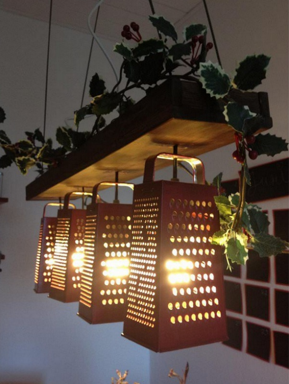 В магазине хорошая дизайнерская лампа или светильник стоят больших денег, по этому проще сделать ее самому. Нужно всего лишь проявить небольшую фантазию. А с идеями я вам помогу. Немного переделав эти идеи под себя, вы получите абсолютно уникальную вещь. Например, можно использовать терки вместо абажура лампы. Такой дизайн добавит немного деревенского стиля в ваш дом: Если хотите больше деревенского акцента, то сделайте подставку для лампы в виде вот такого квадропода: Можно даше взять простую ветку дерева и немного обработать ее: А для детской комнаты можно использовать вот такой забавный вариант, приделав к патрону для лампочки ножки и ручки: Завалялся старый скейтборд? Не выкидывайте его, а используйте в качестве настенного светильника: В конце концов, можно просто взять бутылки красивой формы и прикрепить к проводу лампочки: Все эти вещи сделать не так уж и трудно. Просто нужно потратить немного времени и вы будете довольны результатом. А что бы не пропустить еще много хороших идей