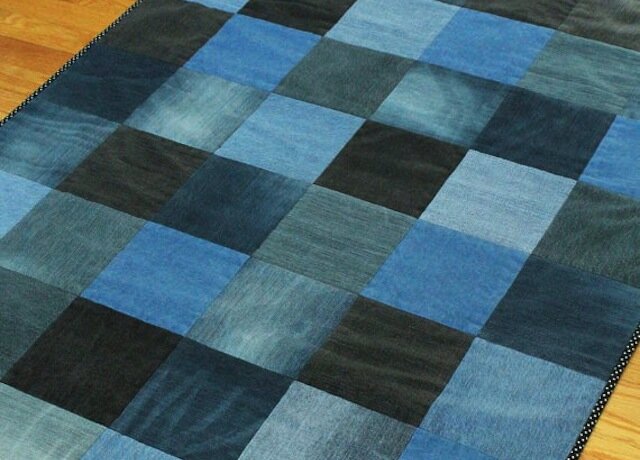 Мне, как женщине практичной (хотелось бы в это верить!), всегда бывает жалко выбрасывать старые джинсы. Такой прочный и никогда не выходящий из моды материал дорогого стоит! Поэтому копились они на самой верхней полочке кладовки годами, и как оказалось не зря…потому что сегодня я нашла им применение. Мы будем шить из них вот такое чудесное покрывало. Процесс создания этого шедевра совсем не сложный, но занимает довольно много времени. Так что, если вы хотите преподнести кому-либо этот королевский подарок на день рождения, лучше начать работу заранее. Начинаем, как всегда, с раскроя. Просто берем и безжалостно режем все наши джинсы на квадратики. Должно получиться примерно вот что: На заметку: Вовсе не обязательно все квадратики делать одинаковыми! Разномастные по цвету, размеру и форме лоскутки смотрятся не менее эффектно. Можно «разбавить» джинсовые детали другими цветами, тоже получится красиво. И еще совет: не старайтесь отрезать все декоративные швы, хлястики и карма