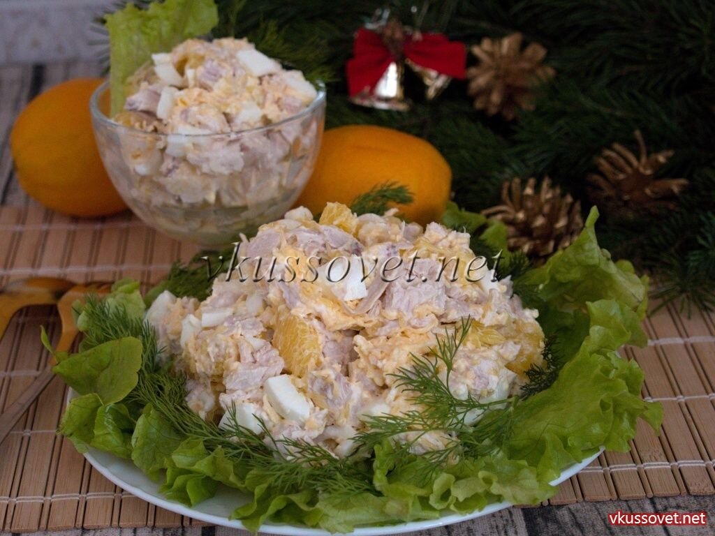 Рецепт приготовления салата с курицей, сыром и апельсинами. Салаты с апельсинами – это самые достойные салаты для праздничного застолья. Существует множество вариаций рецептов с этим фруктом, например, салат из апельсина и крабовых палочек. По этому рецепту салат готовится с отварным куриным мясом, свежим апельсином и сыром, а гармонично все эти ингредиенты объединяет соус из майонеза и чеснока. Подавать такой салатик можно по-разному: выложить в глубокую салатницу, либо горкой на свежую зелень или в индивидуальных приборах (чашах, фужерах, бокалах, креманках и т.п.). Освежите салат аппетитной зеленью и подавайте к столу. Необходимые ингредиенты: - 1 куриная грудка; - 2 апельсина; - 200 г. сыра; - 3 – 4 яйца; - 2 – 3 зубка чеснока; - 3 – 4 ст. ложки майонеза; - зелень (для украшения). Как приготовить салат с курицей и апельсинами:http://vkussovet.net/1327-salat-s-kuricey-i-apelsinami.html