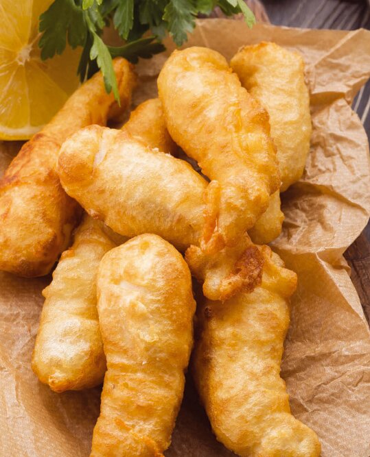 соль, молотый чёрный перец Приготовление: Минтай разделать на филе без кожи, филе нарезать брусками, приправить лимонным соком, шинкованным укропом, солью и перцем. Тем временем приготовить соус: смешать огурцы, майонез, горчицу и шинкованный укроп. Разогреть растительное масло для фритюра. Приготовить кляр: смешать муку, крахмал, разрыхлитель и добавить воду так, чтобы получилось жидкое тесто (как для блинчиков). Запанировать рыбу в муке, обмакнуть в кляр и жарить в масле до золотистого цвета. Выкладывать на салфетку для удаления излишков жира. Подать горячей с соусом. Приятного аппетита!!