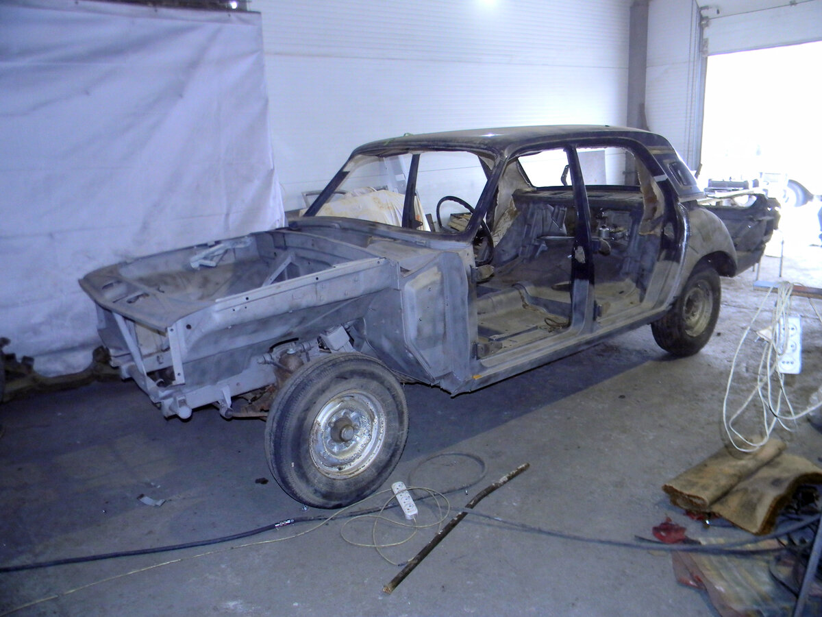 Кузов "двадцатьчетверки" вернулся с пескоструя. Пескоструили подкапотное пространство, багажник, полы салона, арки, пороги, нишу стеклоочистителей, проем заднего стекла. Дырок много, сварочных работ будет много. Общий вид автомобиля после пескоструя. Заднего левого крыла нет, оно было заменено в мохнатые времена с помощью газовой горелки. Мало того, что швы соответствующие, так оно еще и стояло криво (машину, видимо, тюкнули в заднюю арку, так ее даже не подтянули перед установкой нового крыла, поставили с провалом). Плюс покраска по транспортировочному грунту. Будет переделано должным образом новым крылом. Отпескоструенное подкапотное пространство.
