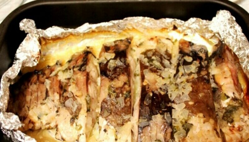 - Берем противень, застилаем его фольгой, сбрызгиваем все маслом и размещаем поверх полукольца лука. Затем выкладываем рыбу спинкой вверх и поверх отправляем маринад, который остался. Накрываем все фольгой.