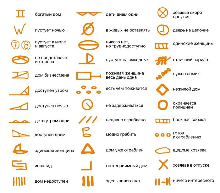 В зависимости от того, легко ли ограбить дом, чем там можно поживится и с какими трудностями столкнуться, информаторы рисовали один или несколько значков из 36 возможных вариантов! Глядя на эту систему шифровок, просто диву даешься, насколько хитры и изобретательны преступники! Конечно же, вскоре воры придумают новые кодовые обозначения, но эта информация ни для кого не будет лишней.