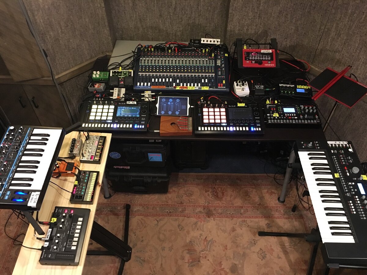 «Что касается маршрутизации MIDI, ERM является основой шоу, отправляя отдельные MIDI-сигналы и информацию о начале-остановке для двух SP-16, iPad и Octatrack. После этого MIDI-выход Octatrack MIDI подключается к коробке Kenton Thru 5, которая позволяет нам управлять до пяти устройств через MIDI от Octatrack. На некоторых треках мы будем играть в клавиши вживую, тогда как на других мы программируем риффы на Octatrack и отправляем их на устройства, которые нужно настроить в прямом эфире.