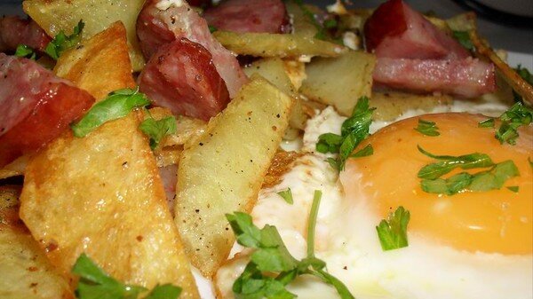 Вам потребуются следующие ингредиенты: 100 гр. копченой колбасы; 2-3 вареных картофелей; 2 яйца; 1 луковица; 1 зубчик чеснока; подсолнечное масло; свежая петрушка. Приступим к приготовлению: