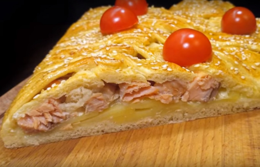Представляем вам рецепт пирога в виде елочки. Готовить мы его будем с рыбой, но вы можете использовать любую начинку: яйца, мясо, сыр. Пирог получается очень вкусным, нежным и сытным. Он обязательно понравится вашим детям, близким и гостям. Пирог будет из дрожжевого теста «Водолаз», готовится оно быстро и просто. Рецепт можно посмотреть тут. Но можно использовать и слоеное тесто, получится тоже очень вкусно. Рыбу лучше всего использовать красную. Она получается более нежная и не имеет сильного запаха. Поэтому является идеальной начинкой. Необходимые продукты Начинаем приготовление