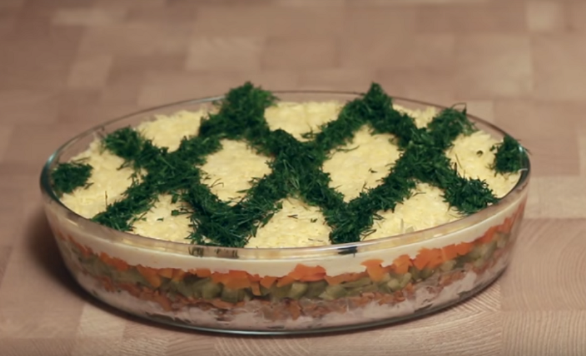 - Собираем салат. Выкладывать мы его будем слоями, делая на каждом майонезную сеточку. Продукты выкладываем в таком порядке: куриное филе, грибы, маринованные огурцы, морковь, майонез и сыр. Сверху украшаем измельченной зеленью. Оставляем настаиваться на 3-4 часа и подаем к столу.