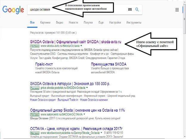 Определившись с маркой автомобиля, стоит задача с поиском места покупки. Подержанные автомобили чаще всего покупают с рук или в автосалоне. Новые – в автосалоне или на заводах изготовителях, как думают покупатели, но это будет тоже автосалон, только территориально располагающийся на территории завода. Как выбрать автосалон и не попасть на мошенников? Об этом и поговорим в данной статье. Данный алгоритм сократит вам время и сохранит деньги. Разберем на примере покупки популярного в России автомобиля ŠKODA OCTAVIA. В первую очередь необходимо зайти на сайт официального производителя или представительства завода изготовителя. Для этого: 1) В поисковике прописываем наименование марки автомобиля. 2) Из предложенных вариантов ищем ссылку с пометкой «Официальный сайт». 3) Переходим по ссылке. 4) Ищем вкладку дилеры. 5) Переходим по во вкладку Дилеры 6) Ищем дилера в своем городе: - в строке поиска прописываем город, где хотим купить; - в настройках поиска лучше поставить «Продажи»
