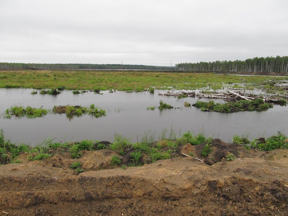 С трудом пробираемся по дорогам дражного полигона. Полигон представляет собой старые дражные отвалы или заполненный водой "польдеры". Дорога проходит по разделяющим их дамбам. Драгу пока не видно.