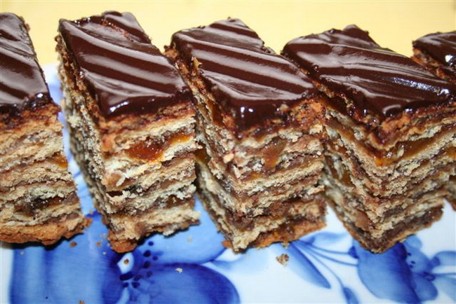 Далее самая трудоемкая часть работы: уложив тесто в форму, смазать его равномерно джемом, посыпать кусочками абрикосов и орехово-сахарной смесью. Затем повторить процедуру, только раскатать следующий пласт теста нужно точно по диаметру формы для выпечки. Каждый очередной пласт необходимо обильно смазывать джемам и посыпать абрикосами и орехами, кроме последнего верхнего седьмого коржа.