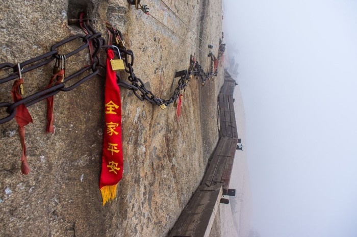 Если вы когда-либо попадете на гору Хуашань, Китай и вы очень впечатлительный, то этот маршрут вам стоит обходить за три километра, ибо эмоциональным туристам лучше к таким местам вообще не приближаться. Речь идет о знаменитой Тропе смерти в Китае. Хуашань — священная гора, которая объединяет пять пиков, расположенных как лепесток. Как раз между самой северной и самой южной вершинами и проложена знаменитая дорога. Сюда стекаются смельчаки со всего света, чтобы показать себе и миру на что способны. Этот «аттракцион» действительно впечатляющий: вас ждет 6-8 часов передвижения по дряхлым дощечкам на высоте 2 километра. Представьте: вы почти весь день «ползете» по дощечкам, шириной 40-50 сантиметров, а под ногами...отвесная скала! Такое рисковое развлечение стоит 20$ плюс дорога на автобусе 3$. Сейчас специально для туристов вдоль тропы прибиты страховочные цепи, но раньше и их не было. Китайцы без страховки вынуждены были преодолевать эти расстояния по доскам. Кстати, маршрут включ