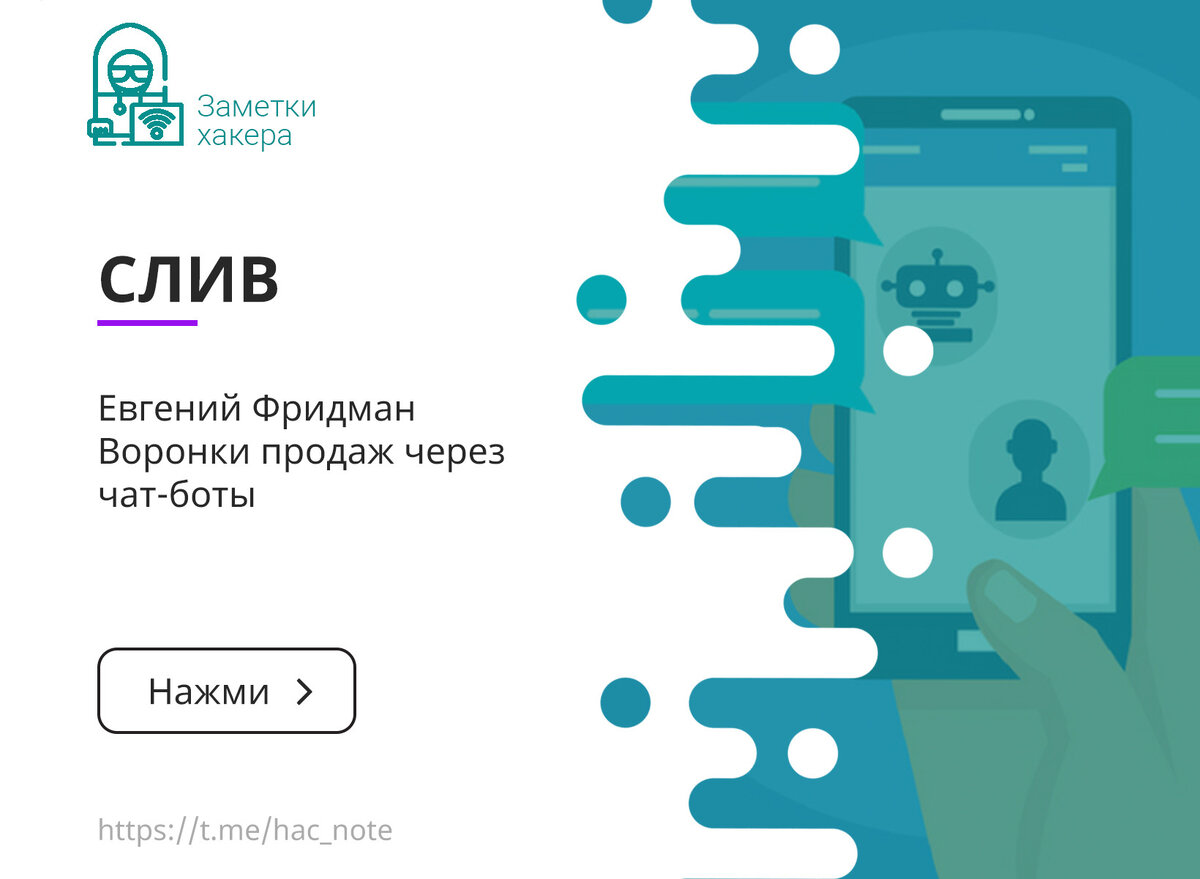 👨🏻💻Прекрасного понедельника всем! 🔥Воронки продаж через чат-боты Автор курса: Евгений Фридман 💡Современный и своевременный пошаговый курс с освоением нового навыка, который щедро монетизируется и особо востребован в самых успешных компаниях. 📚Продажник ☁️Скачать ============================================== Заметки хакера - ПОДПИШИСЬ