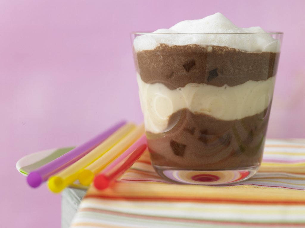 Очень вкусное лакомство. Ингредиенты: Бананы примерно 100 грамм Йогурт ванильный 150 грамм Молоко 2 столовые ложки Какао-порошок 1 чайная ложка Шоколадная стружка 1 чайная ложка Грецкий орех 2 зерна Приготовление: Нарезать на кусочки пол банана. Выложить в глубокую ёмкость нарезанный банан, добавить йогурт, молоко всё пюрировать с помощью блендера. В стакан вылить половину от полученной массы, добавить какао-порошок, шоколадную стружку и хорошо перемешать. Порубить орехи, добавить к банановой массе, перемешать. Осторожно перелить в стакан с какао при помощи ложки молочно-банановую массу. Подавать с толстой трубочкой. Приятного аппетита.