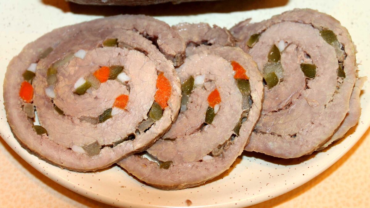 1. Разрезаем вдоль мясо телятины и отбиваем. У нас должен получиться плоский кусок. Отбитое мясо перчим и солим. Небольшими ломтиками нарезаем копченое мясо и бекон, выкладываем на телятину ровным слоем.