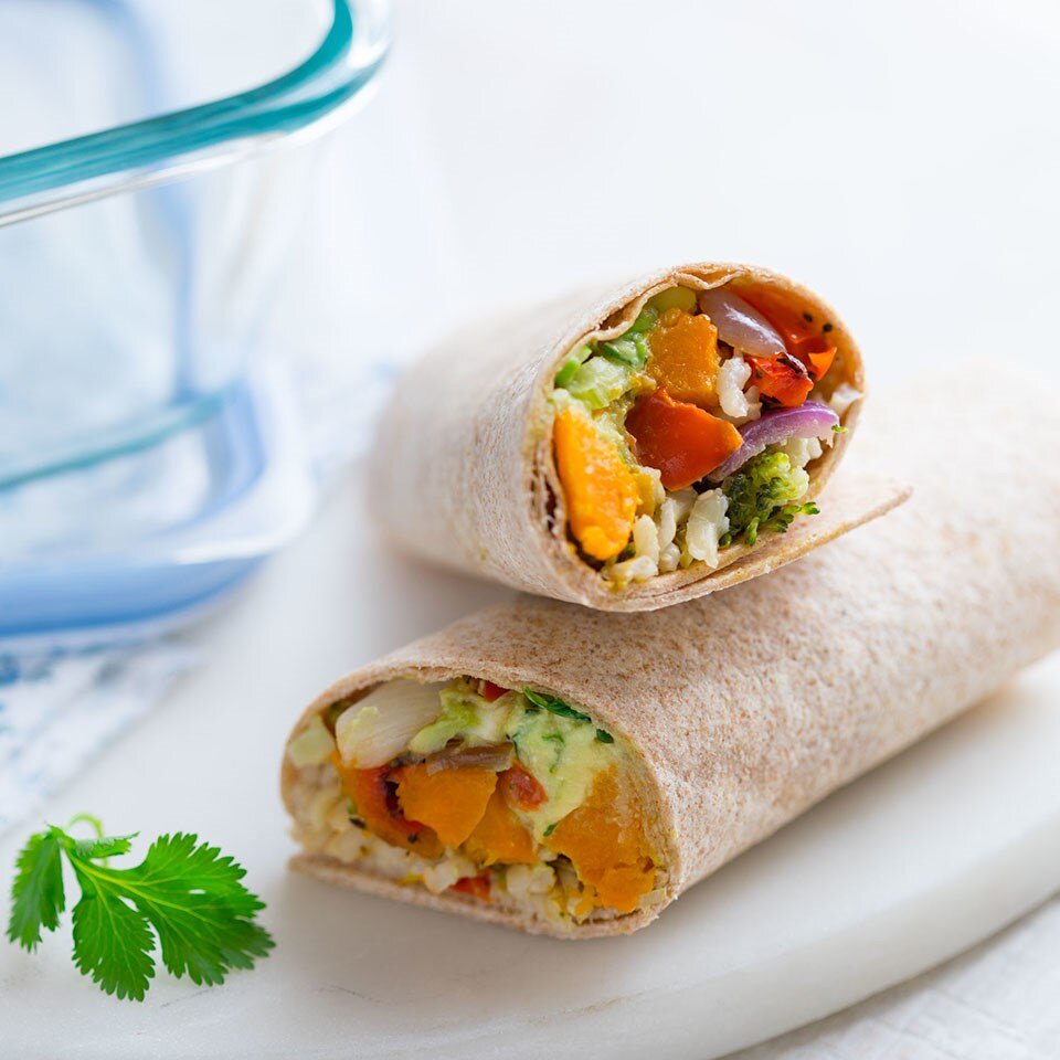 - Разместите тортилью на рабочую поверхность. Положить в центр рис. Сверху выложите обжаренные овощи, авокадо, йогурт, лук и кинзу. Сверните тортилью в ролл и разрежьте пополам.