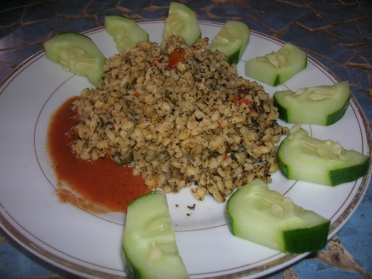 Чтобы приготовить этот плов вам понадобится: 1 стакан бургули, пара веточек петрушки, соль, черный перец, сухая мята, 1 большой помидор, 1 большая луковица.