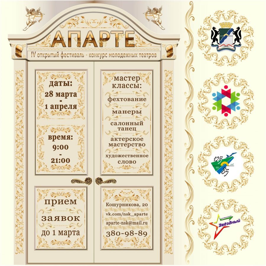В заочном туре фестиваля приняли участие более 30 молодежных коллективов. С 28 марта по 1 апреля в Новосибирске состоится одно из главных мероприятий города в области развития и продвижения театрального творчества – IV открытый городской фестиваль молодёжных любительских театров «АПАРТЕ», сообщили организаторы фестиваля. Более 30 молодёжных коллективов из Новосибирска, Омска, Междуреченска, Барнаула, Бийска, Москвы и Перми приняли участие в заочном туре «АПАРТЕ». С 28 марта по 1 апреля на очном туре любительские театры представят спектакли зрителям и экспертному совету: проректору по учебной и воспитательной работе Новосибирского государственного театрального института Василию Кузину, руководителю курса «Актёрское мастерство» в Центре внешкольной работы «Галактика» Кириллу Тархову, драматургу, члену союза писателей России, соруководителю товарищества «ДрамСиб», редактору отдела публицистики журнала «Сибирские огни» Дмитрию Рябову, руководителю театра-студии «Южный полюс» молодёжного ц