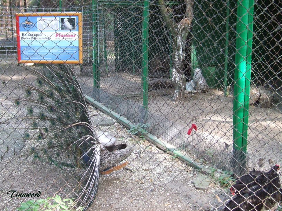 В зоопарке павлин не захотел нам позировать. Он был увлечен курочками. А вот этот просто отдыхал в окружении своих курочек. Вольер хороший тенистый, только мне кажется, что слишком он густо населен не только павлинами. В этом вольере и белая сова и другие какие-то курочки. А вот белого павлина, такого какой есть в ростовском Парке Революции нет.