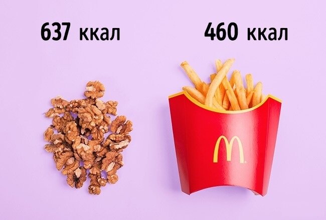 Возможно, калорийные продукты не так уж вредны для фигуры Продукты, вредные для фигуры, мы все их знаем. Бургеры, чипсы, газировка, пирожные, торты, булочки, пицца. Недавно по интернету прокатилась подборка фоточек – на них привычные нам продукты, воспринимаемые как диетические, и в сравнении якобы мегакалорийные блюда. Так вот что должно поразить невнимательного покупателя - диетические продукты не такие уж малокалорийные, а якобы вредные не сильно отличаются от них. А я это знаю давно. Я считаю калорийность своих продуктов больше десяти лет. Я уже почти не разглядываю упаковку, и так примерно знаю, что там будет написано, никаких сюрпризов. В этом и есть секрет, почему я не отказалась от фаст-фуда. Небольшой минивоппер или бургер в макдональдсе равнозначен тарелке полезной овсяной каши. Конечно, каждый день так завтракать не будешь, и никто не спорит с тем, что соотношение полезных веществ в фастуфуде минимально, но имейте в виду, что иногда побаловать себя вполне возможно, есл