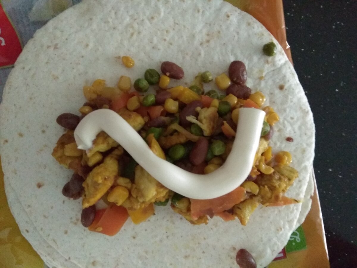 Канонический рецепт Ингредиенты : Тортилья 4 шт. Красный лук 1 шт. Консервированная кукуруза 150 г Консервированная фасоль 70 г Сок лайма 2 ч.л. Петрушка по вкусу Соль по вкусу Куриное филе 3 шт. Растительное масло 2 ст.л. Листья салата пучок Сметана 150 мл Красный перец 1/4 ч.л. 1. Нарезать кубиками лук и помидоры. Измельчить петрушку. 2. Выложить в миску кукурузу, фасоль, помидоры. Посолить, поперчить. 3. Куриное филе нарезать маленькими кубиками. 4. В сковороде разогреть растительное масло на среднем огне. Обжарить филе в течение 5 минут, постоянно помешивая. Добавить 2 чайные ложки сока лайма и 1/4 чайной ложки красного перца и готовить еще 1 минуту, постоянно помешивая. Снять с огня. 5. Нарезать листья салата. 6. На лепешку выложить 2 столовые ложки овощной смеси, кусочки курицы и немного салата. Сверху выложить 1 столовую ложку сметаны и завернуть лепешку. Мой рецепт с картинками) Нарезаем морковку ,сельдерей,половинку болгарского перца полосками ,лук куби