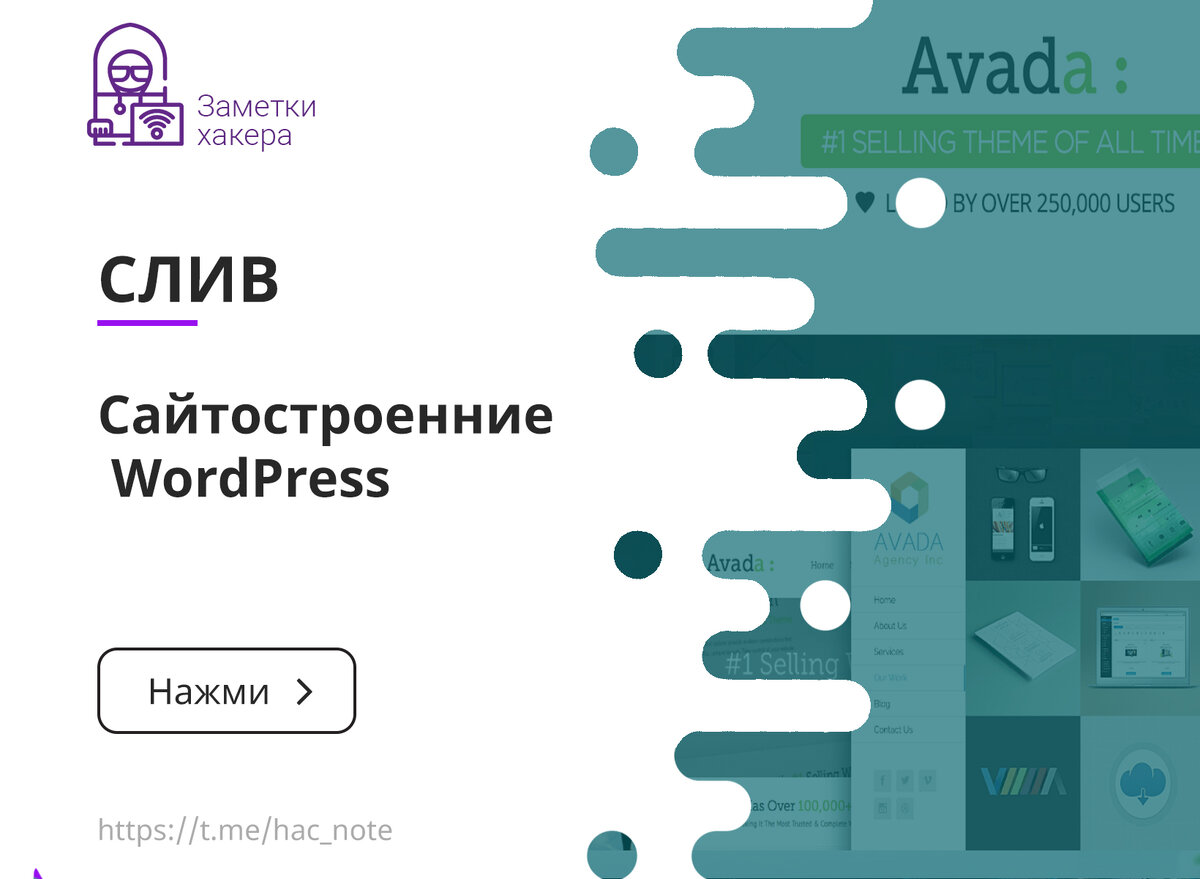Описание : Премиальная платная тема для WordPress “AVADA” и видеокурс по ее настройке и созданию сайта на базе этого шаблона. Тема Avada — это настоящий бестселлер в мире WordPress! С момента своего релиза в августе 2012 года, Avada была скачана более 327.000 раз с самого крупного магазина шаблонов и тем ThemeForest, что определенно делает ее одной из самых популярных премиум тем в WordPress. Скачать курс ============================================== Заметки хакера - ПОДПИШИСЬ