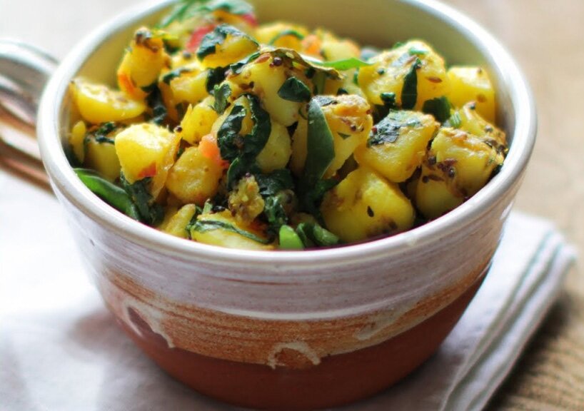 Ингредиенты: шпинат, картофель, масло ги или кунжутное масло, лук, паста из имбиря, паста из чеснока, молотый кориандр, молотый перец чили, молотый черный перец, соль Рецепт: SAAG ALU (Peppy spinach and potatoes)