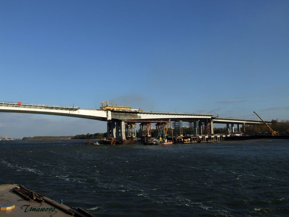 Судоходство по Дону было приостановлено. Две специальные баржи выдвинули центральный пролет в фарватер, чтобы установить его в необходимое положение положение. Когда конструкцию была закреплена наверху судоходство восстановили. Теперь мостостроителям нужно выполнить огромный объем крепежных и сварочных работ.