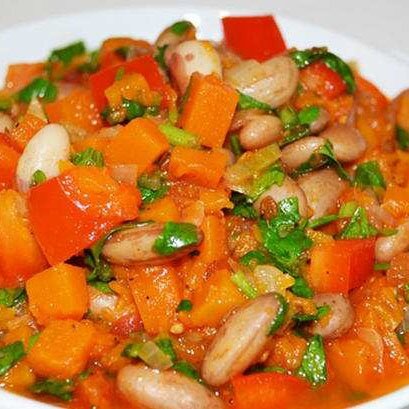 Ингредиенты: паприка свежая, фасоль, зеленая цуккини, тыква, масло ги, кумин семена, горчицы семена, аджван семена, гарам масала, куркума молотая, асафетида, соль Рецепт: На 4 порции: 4 чашки порезанных овощей ( перец, фасоль, зеленая цуккини, тыква ), 2 ст.л. масла, 1/2 чайной ложки семян кумина, 1/2 чайной ложки семян горчицы, 1/4 чайной ложки семян аджвана, 1/2 чайной ложки гарам масалы, 1/4 чайной ложки куркумы, щепотка асафетиды, 1/2 чайной ложки соли. В разогретое масло всыпать семена кумина, горчицы, аджвана и асафетиду, когда семена начнут потрескивать, добавьте гарам масалу, перец и куркуму. Перемешайте, добавьте овощи и соль, хорошо перемешайте, уменьшите огонь и закройте крышкой. Тушите на маленьком огне 15 минут.