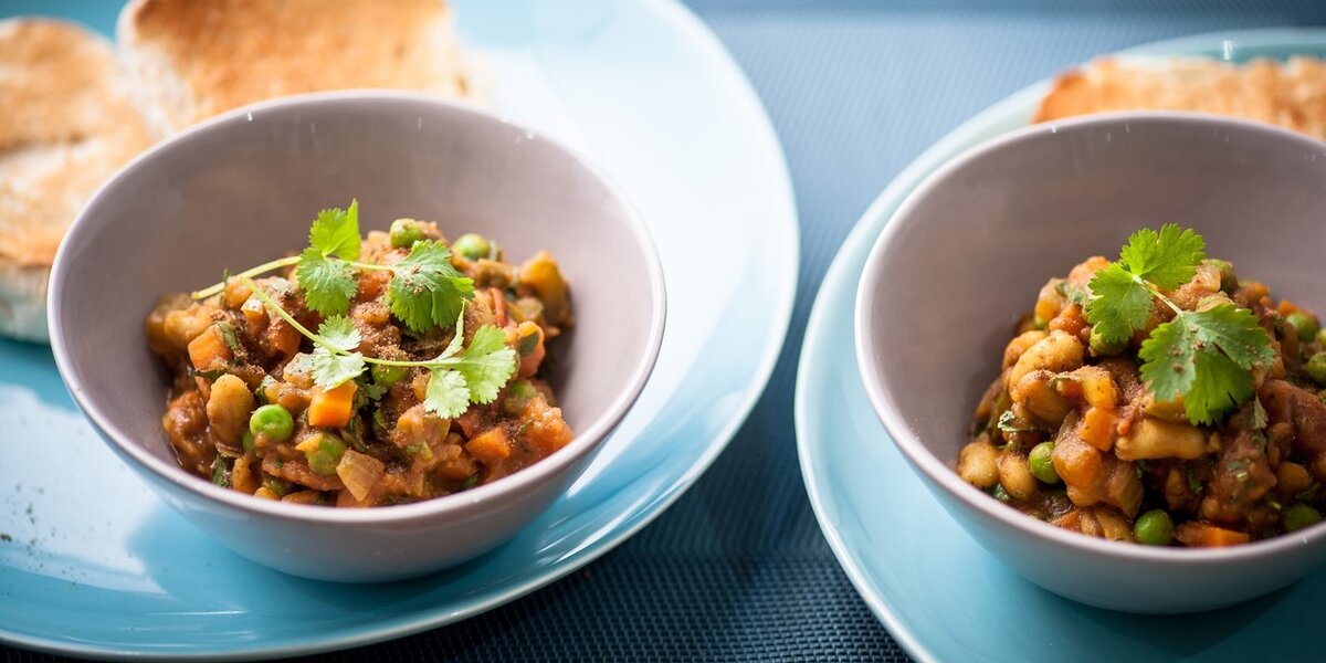Ингредиенты: картофель, растительное масло, лук, зеленый перец чили, имбирно-чесночная паста,куркума, соль, помидоры, томатная паста, морковь, замороженный горошек, консервированная фасоль, перец болгарский, гарам масала, лимонный сок, кинза, булочки Рецепт: 6 порций 50 минут