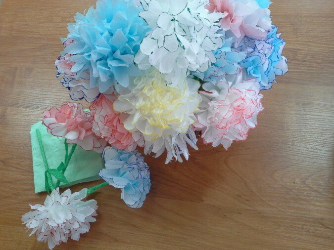 Ход работы: Для работы понадобятся следующие материалы: 1. Салфетки бумажные 2шт. (2 цвета) 2. Ножницы 3. Степлер 4. Бамбуковая (или любая другая) палочка 5. Гофрированная бумага зеленого цвета (полоска шириной 2 см) 6. Клей ПВА Кладем одну салфетку на другую, складываем обе салфетки гармошкой. В середине гармошки степлером ставим скобку. Края гармошки закругляем с обеих сторон. Края гармошки закругляем с обеих сторон. Начинаем отделять слои по одному и собирать их к центру, приподнимая от краев. Если на этапе закругления гармошки подкрасить края во всей "пачке" фломастером,получатся вот такие лепестки: Далее работаем над стебельком цветка. Полоску гофрированной бумаги накручиваем на палочку наискосок, подклеив ее на палочку в самом начале и в конце. Полоску гофрирванной бумаги длиной примерно 15 см. обрезаем по краям под углом и завязываем узлом посередине палочки, капнув капельку клея. Каплей клея крепим готовый стебелек к шапочке цветка. Наш ч