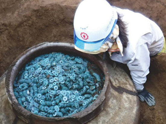 Клад из сотен тысяч медных монет, отчеканенных полтысячелетия назад, обнаружили специалисты в японском городе Хасуда. Как предполагается, богатства были спрятаны местными жителями в неспокойный для страны период, получивший название «эпоха воюющих провинций» Как сообщают специалисты, ими был найден кувшин высотой 70 сантиметров, внутри которой находилось 260 тысяч монет. Судя по тому, что в каждой из них было проделано отверстие, специалисты предполагают, что ранее монеты были связаны между собой верёвкой, которая, впрочем, не сохранилась. Период Сэнгоку, или «Эпоха воюющих провинций» — период в японской истории со второй половины XV до начала XVII века. Его название содержит отсылку к эпохе Воюющих царств в Китае, охватившей период с V века до н. э. до объединения Китая Цинь Шихуанди в 221 до н. э. Обе «эпохи» вошли в историю тем, что страны разрывали конфликты, спровоцированные борьбой за власть. В Японии период Сэнгоку ознаменовался потерей сёгунами династии Асикага контроля над стр